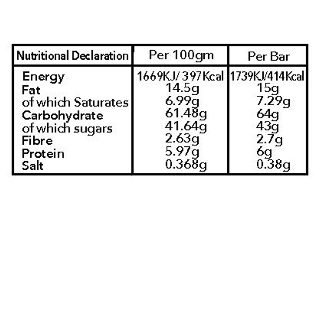 INGREDIENTS: OATS (Gluten Free), Partially Inverted Sugar Syrup, Unsalted Plant Butter, Plant Oils. (Sustainable Palm, Sunflower, Rapeseed), Soft Dark Brown Sugar, Sugar, Glucose Syrup, Skimmed Milk Powder, Cocoa Butter, Cocoa Mass, Sunflower Oil, Whey Permeate (Milk), Palm Fat, Fat-Reduced Cocoa Powder, Milk Fat, Barley Malt Extract, Salt, Emulsifier (Soya Lecithins), Egg White Powder (May Contain Peanuts and other Nuts).